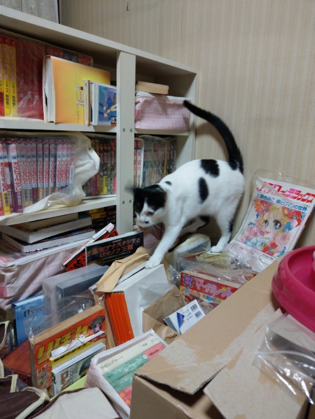 うちもよく書類や本の山の上を渡ってます(^^;)