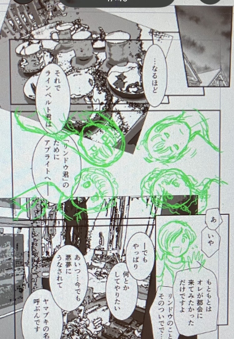 画像は、ユリとマーシュを迎えてお茶するシーン、実際にティーカップを並べて写真を撮って、その画像を加工しました。